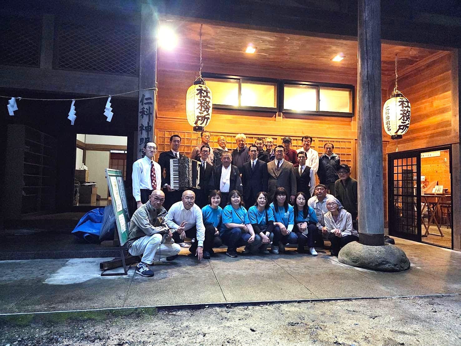 東京大衆歌謡楽団は、富山県出身の四兄弟によるユニットで、長男孝太郎がボーカル、次男雄次郎がアコーディオン、三男龍三郎がウッドベース、四男圭四郎がバンジョーを担当し、2024年に結成15周年を迎えたグループです。 東京大衆歌謡団その名前のように、激動の昭和時代に愛された数々の楽曲を演奏し、ファンクラブを含む多くの皆様に愛されており、各地の神社などで奉納演奏を行っているようです。ここ大町市社地区での敬老会に招かれた縁で仁科神明宮での奉納演奏が実現しました。10月5日(日)に2回行われた公演には、数多くの方が遠方からも参集し演奏に聞き入っておられました。何も知らずに仁科神明宮への参拝に訪れた方々も多くいるので、氏子総代と