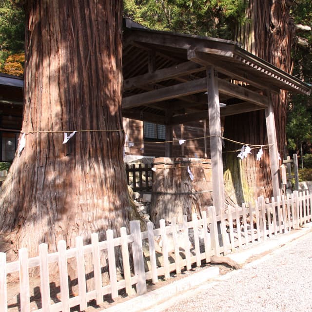 指定区域の面積19,258平方m。スギ・ヒノキが主で、他にアカマツ・クリ・コナラ・ツガ・モミなどがあり、いずれも巨木・大木である。境内に入ってすぐ左の三本杉は、中1本を欠損しているが、目通り周囲5.70m・5.45m、樹高50mをこえ美しい。これを加えて境内には、幹囲2mをこえる巨木がスギ20数本、ヒノキが10数本生育する。巨木の茂る下木としてアブラチャン・カラコギカエデ・コシアブラ・サンショウ・ミツバツツジ・タラノキ・ナナカマド・ムラサキシキブなどが見られ、林床にはコブナグサ・タガネソウ・ミズヒキ・ミズギボウシ・ヤブタバコなどの草木が生えている。 |