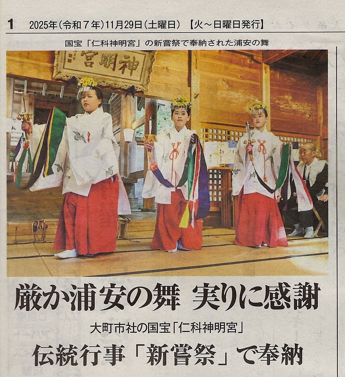 本年は拝殿の大前において、参拝者の皆様にも近くで浦安の舞の奉納をご覧頂けました。舞姫たちは、11月初旬より指導神職のもとで練習を重ねて無事舞を奉納してくれました。浦安の舞は、昭和15年11月10日に開かれる「皇紀二千六百年奉祝会」に合わせ、全国の神社で奉祝臨時祭を行うに当たり、祭典中に奉奏する神楽舞を新たに作ることが立案され、当時の宮内省楽部の楽長である多忠朝が国風歌舞や全国神社に伝わる神楽舞を下地に作曲作舞した神楽舞です。 (写真は11月29日の大糸タイムス一面です)。