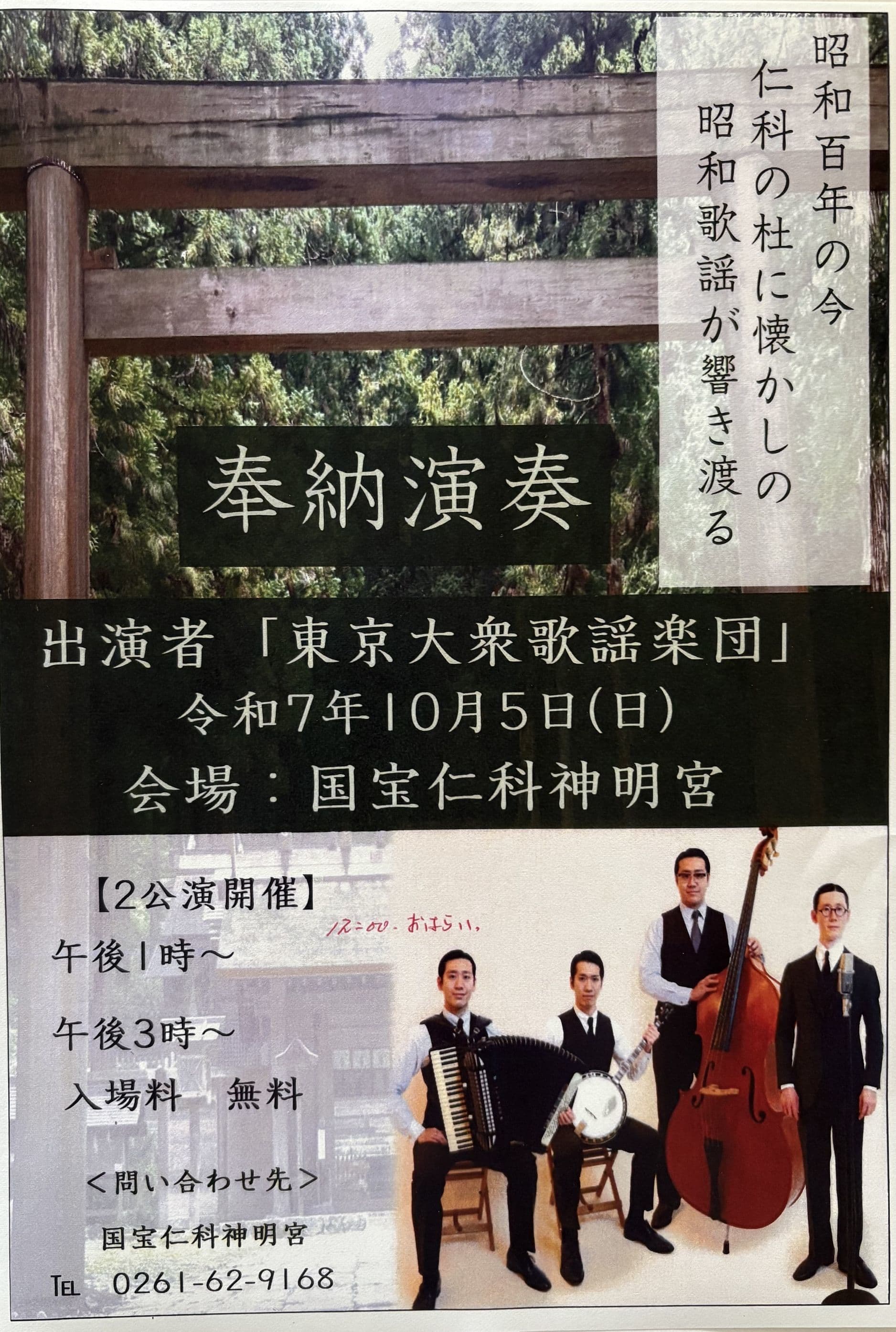 東京大衆歌謡楽団は、富山県出身の四兄弟によるユニットで、長男孝太郎がボーカル、次男雄次郎がアコーディオン、三男龍三郎がウッドベース、四男圭四郎がバンジョーを担当し、2024年に結成15周年を迎えたグループです。 東京大衆歌謡団その名前のように、激動の昭和時代に愛された数々の楽曲を演奏し、ファンクラブを含む多くの皆様に愛されており、各地の神社などで奉納演奏を行っているようです。ここ大町市社地区での敬老会に招かれた縁で仁科神明宮での奉納演奏が実現しました。10月5日(日)に2回行われた公演には、数多くの方が遠方からも参集し演奏に聞き入っておられました。何も知らずに仁科神明宮への参拝に訪れた方々も多くいるので、氏子総代と