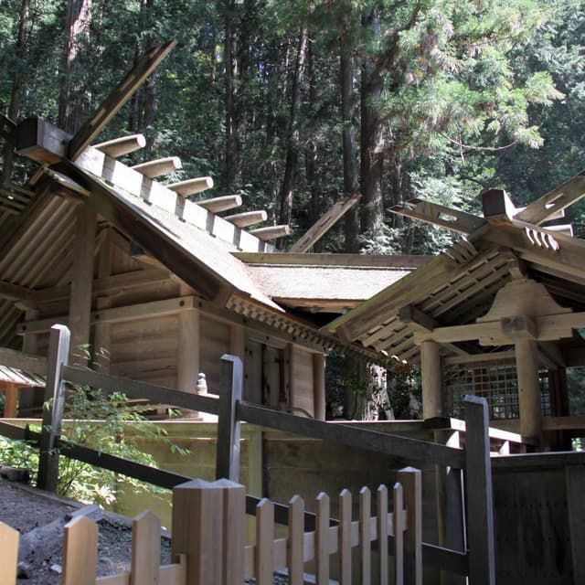神明造の建築物としては、わが国で唯一の国宝である 本殿は、桁行3間、 梁間 はりま 2間、神明造、 桧皮葺 ひわだぶき 。中門( 御門屋 みかどや )は四脚門、切妻造、桧皮葺。 釣屋 つりや がこれらを連結している。ともに寛永13年(1636)の造営で、江戸時代初期の端整な建築である。神明造の建築物としては、わが国で唯一の国宝である。 創祀 そうし については不明だが、平安時代に遡ると考えられている。 |