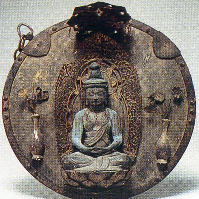 銅製の円板に別鋳の仏像をとりつけ、あるいは手彫りするか打出した 懸仏 かけぼとけ が16面あるうち、5面が指定、あとは附属指定。仏体は伊勢内宮の天照大神の 本地仏 ほんじぶつ である大日如来がほとんどである。年代の明らかなもので一番古いものは、裏面に朱の漆で「弘安元年(鎌倉時代中頃の1278)卯月廿一日、大施主平氏女」と記されている。その他には「弘安九年(1286)十二月廿二日、妙法尼」の墨書銘(ぼくしょめい)のあるものや「志んめい」「志んめいの御しやうたい」と記されたものがある。紀年銘のないものが多いが、作風から鎌倉から室町時代にかけて造られたものと考えられる。 |